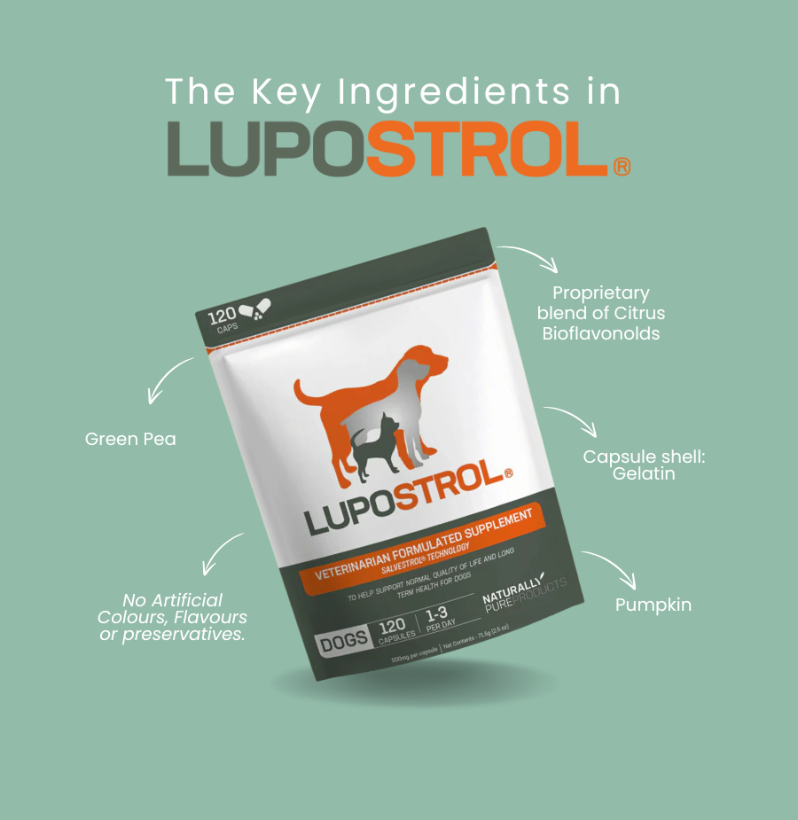 Enhance your dog's health with Lupostrol®, designed for optimal nutrition and wellness. This advanced supplement supports overall vitality, promoting a healthy coat, strong bones, and balanced energy levels. Give your furry friend the best in health and nutrition with Lupostrol®.
